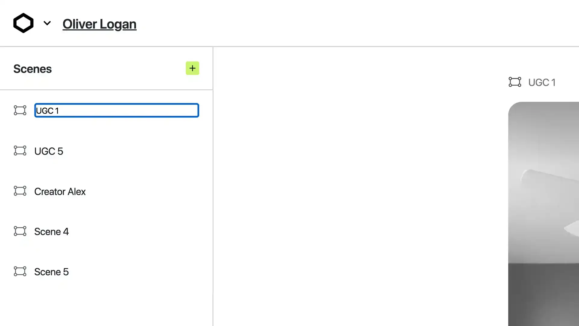 The studio is Novel's workspace where you make your assets shoppable. In the main area there is a large placeholder for adding content to your Scenes. You can customize the names of your scenes via the left panel.