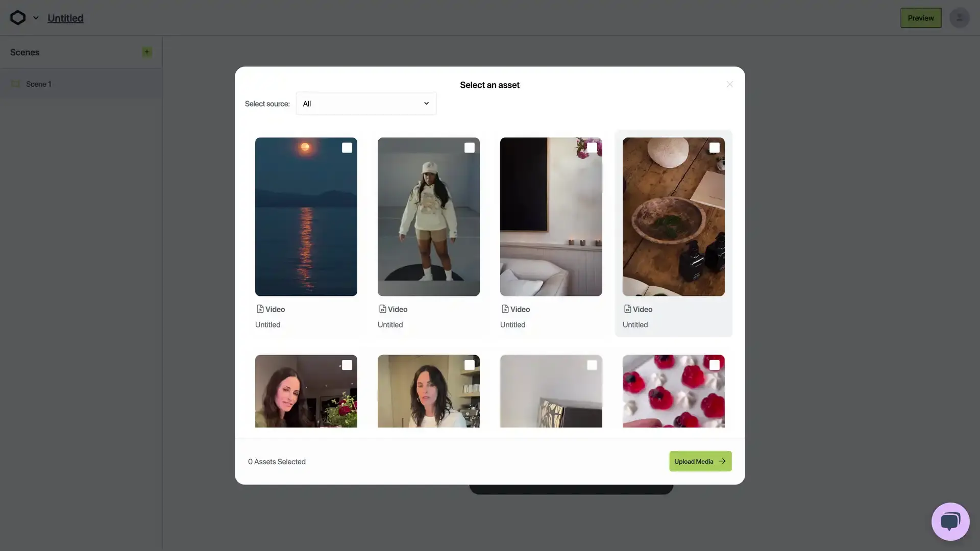 To start, click the central cloud upload icon to trigger the Select an asset modal. Within the select an asset modal, there is a grid of asset thumbnails. Each asset thumbnail includes a checkbox to select the asset.