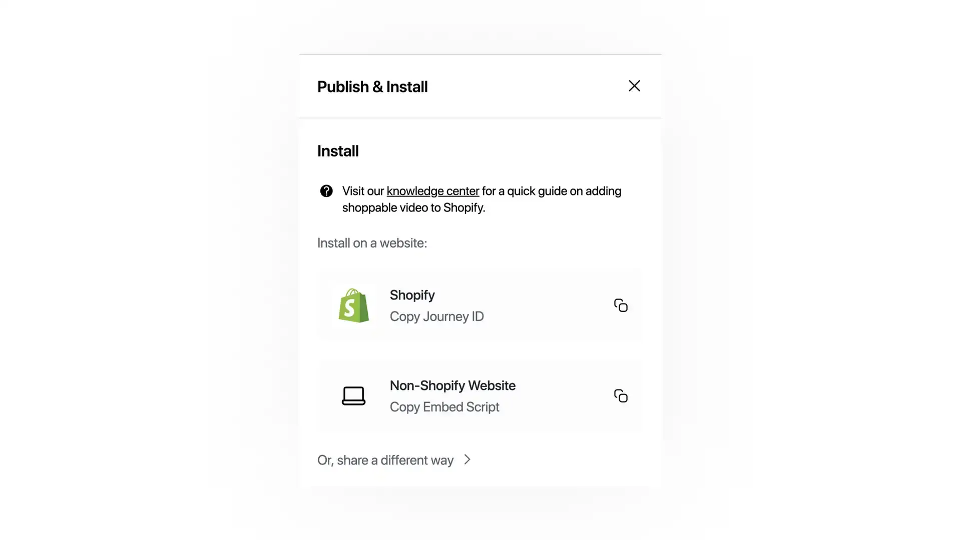From the Publish & Install modal, after clicking Publish, two copy-to-clipboard buttons will be exposed. One is Shopify: Copy Journey ID, the other is Non-Shopify Website: Copy Embed Script.