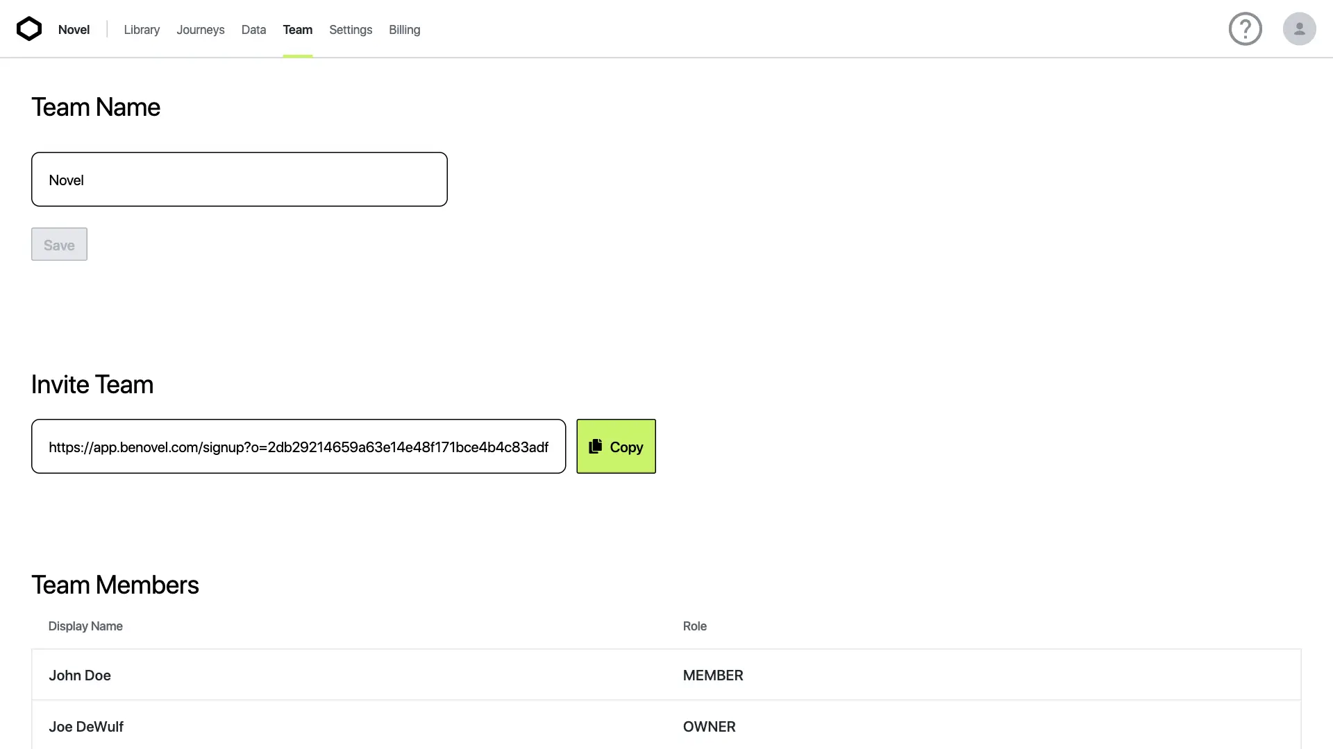 To manage your team settings in Novel, navigate to the Team Management section. Here, you can edit the team name, invite new members, and view a list of current team members along with their roles.