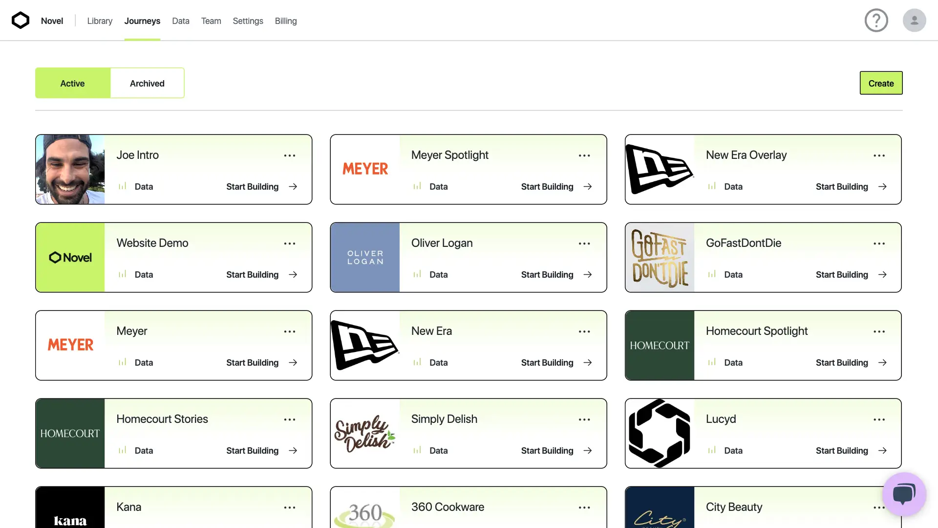 In Journeys, you'll see a list of journey cards under the Active tab. Each journey card contains essential details such as the title of the journey, a Data label, and a Start Building button.