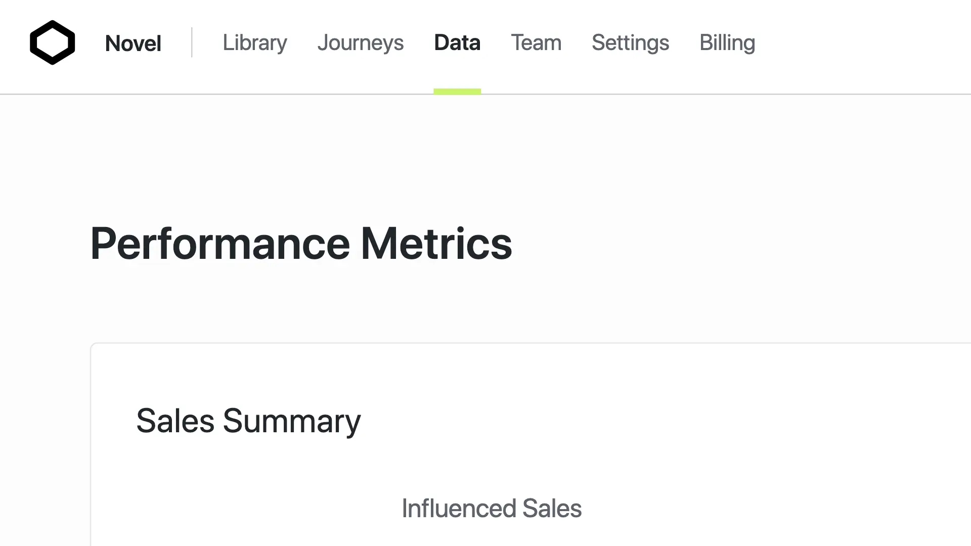 The Performance Metrics screen in Novel provides detailed insights into your video's impact. The screen is divided into two main sections: Sales Summary and Engagement Summary.