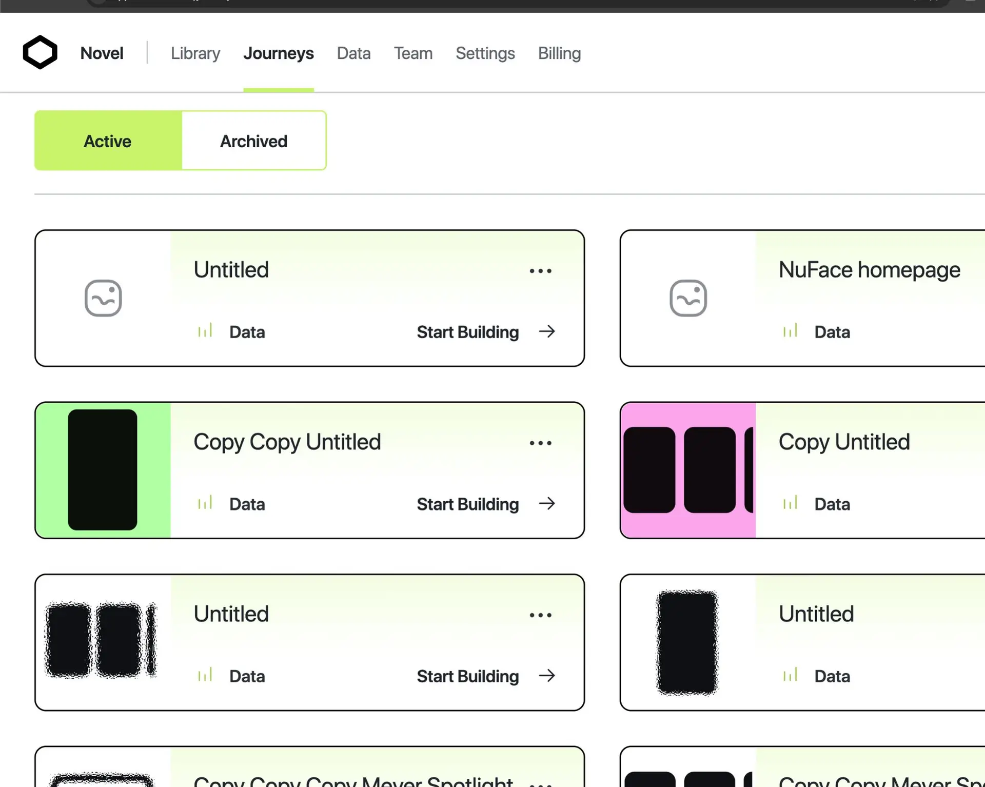 To view and manage your active journeys on the Novel platform, navigate to the Journeys page in the main navigation menu. Here, you will find two sub-tabs: Active and Archived. Ensure that the Active tab is selected to see your current journeys.