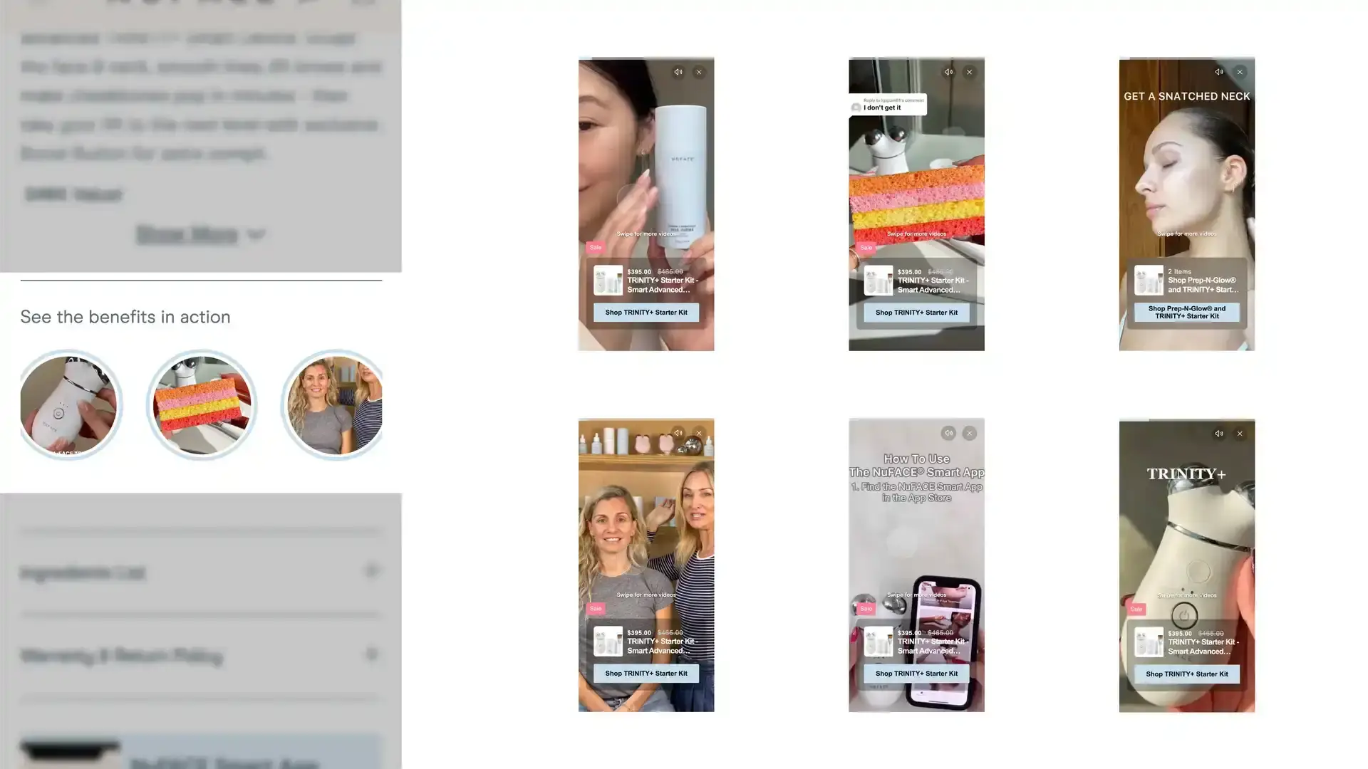 NuFACE, for instance, uses the Stories layout to display vertical video thumbnails showcasing real customers using their products. This layout is visually attractive and engages users by integrating short-form videos, such as TikToks and Reels.